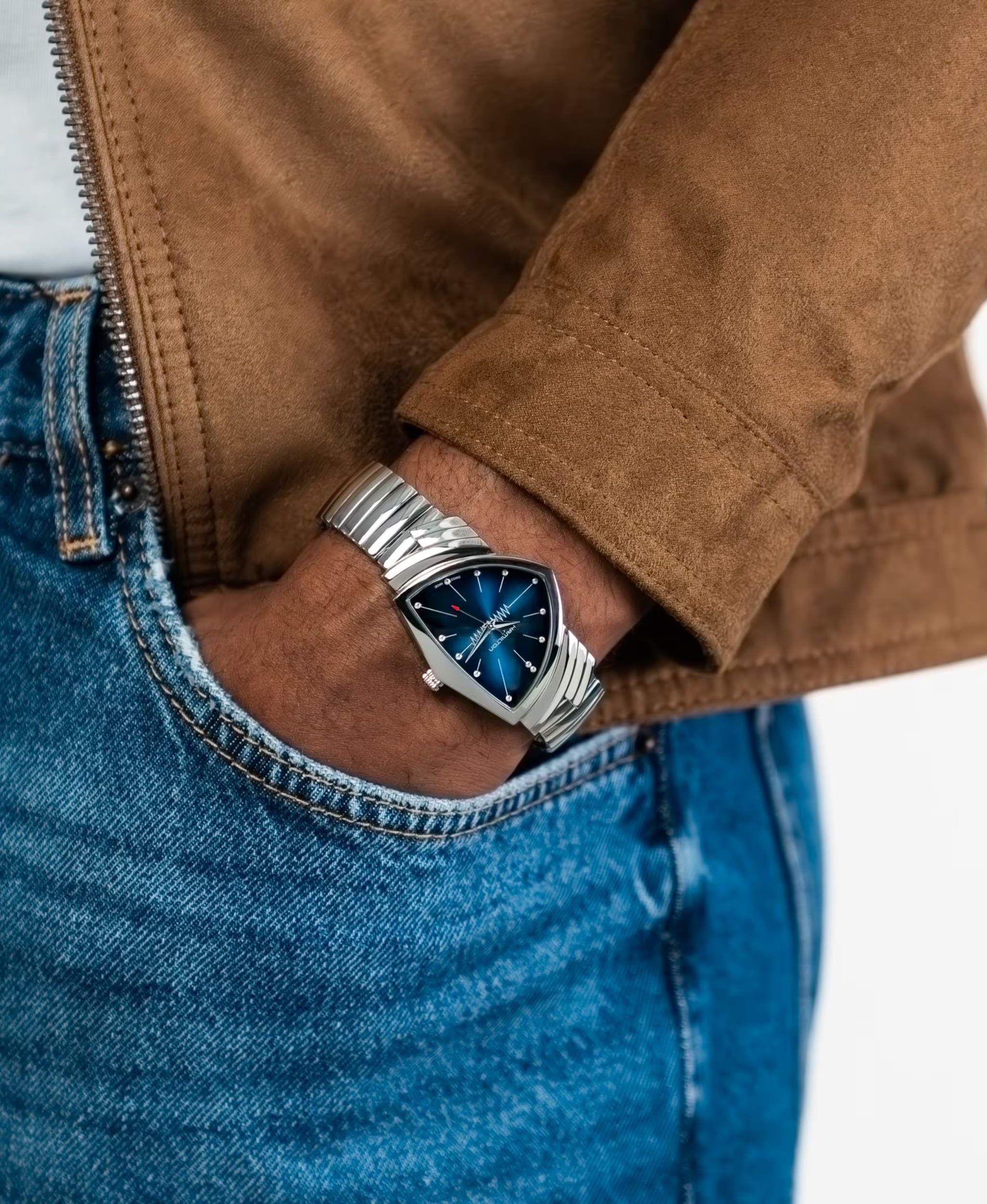 Hamilton Ventura Quartz es un ícono del diseño, famoso por su distintiva caja triangular de acero (32x50mm). Impulsado por un preciso movimiento de Cuarzo, rinde homenaje al modelo que usó Elvis Presley. Destaca su llamativa esfera azul y su brazalete de acero a juego. Un diseño futurista.