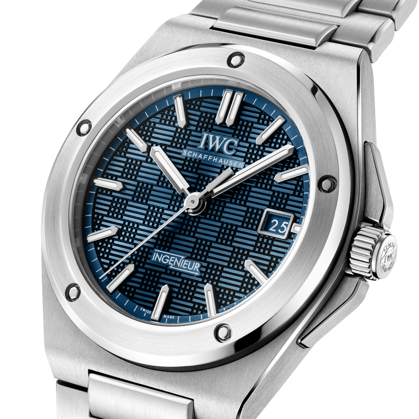 IWC Ingenieur Automático es la versión ligera y deportiva del diseño SL de Genta en 40 mm. Su caja y brazalete de titanio pulido y satinado lo hacen robusto. Destaca el bisel atornillado y la esfera con estructura de cuadrícula azul. Impulsado por el calibre IWC 32111, ofrece protección antimagnética.
