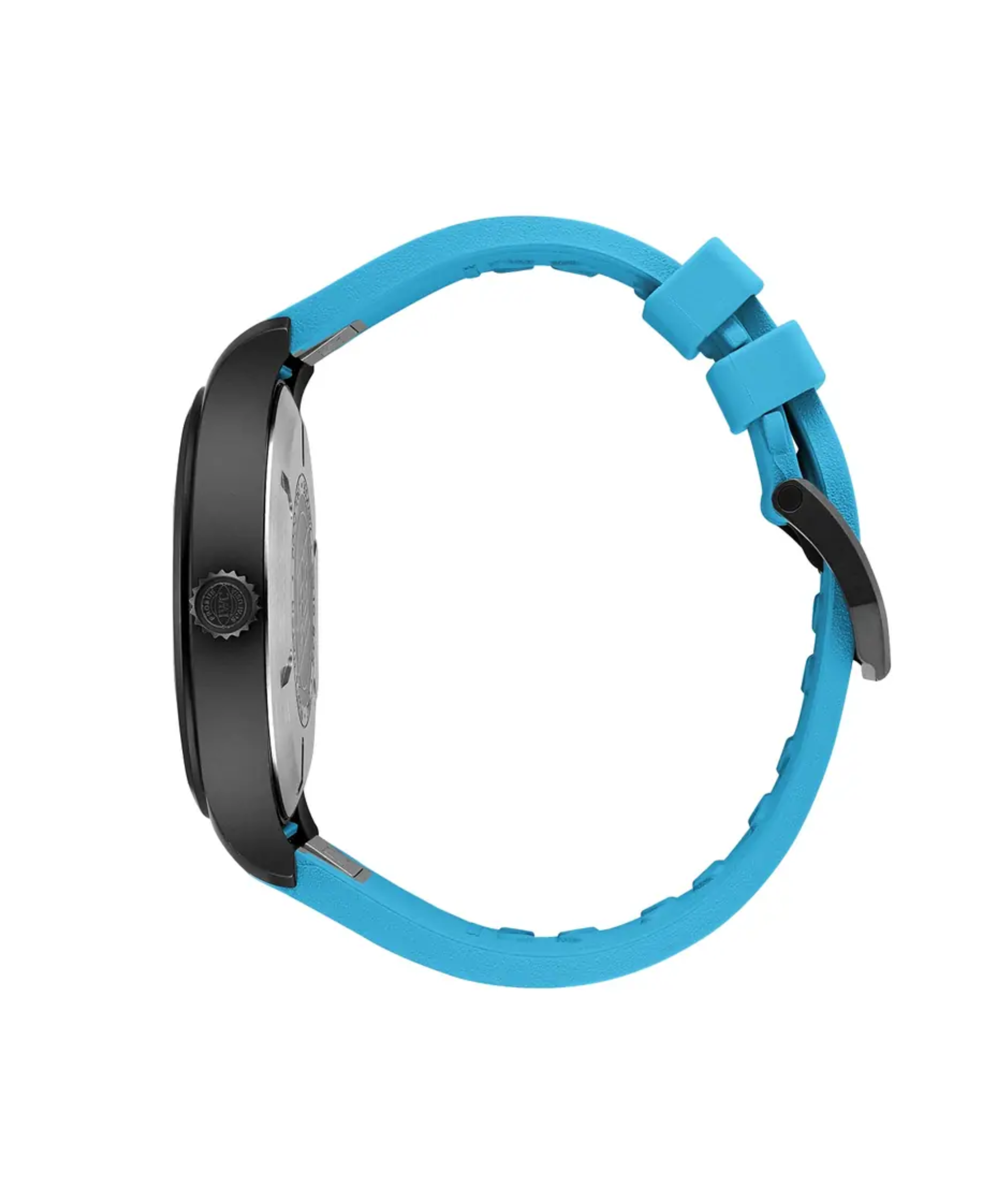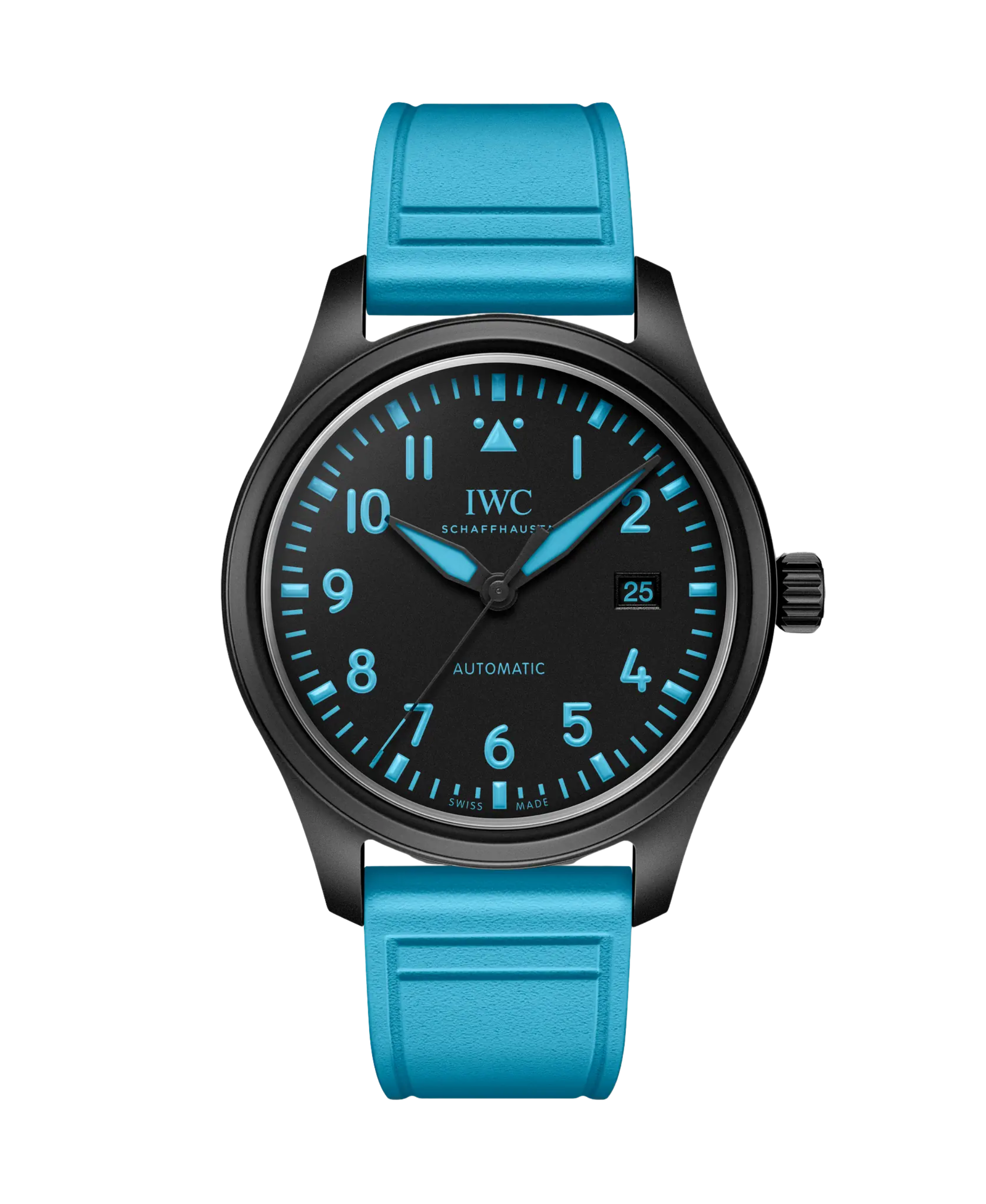 Edición limitada a 1.063 unidades inspirada en George Russell. Caja de cerámica negra de 41 mm con corona Ceratanium®, esfera negra con detalles y Super-LumiNova® azul, y correa de caucho azul con sistema EasX-CHANGE®. Incorpora el calibre automático IWC 32112 con 120 h de reserva y fondo de titanio grabado con el «63».